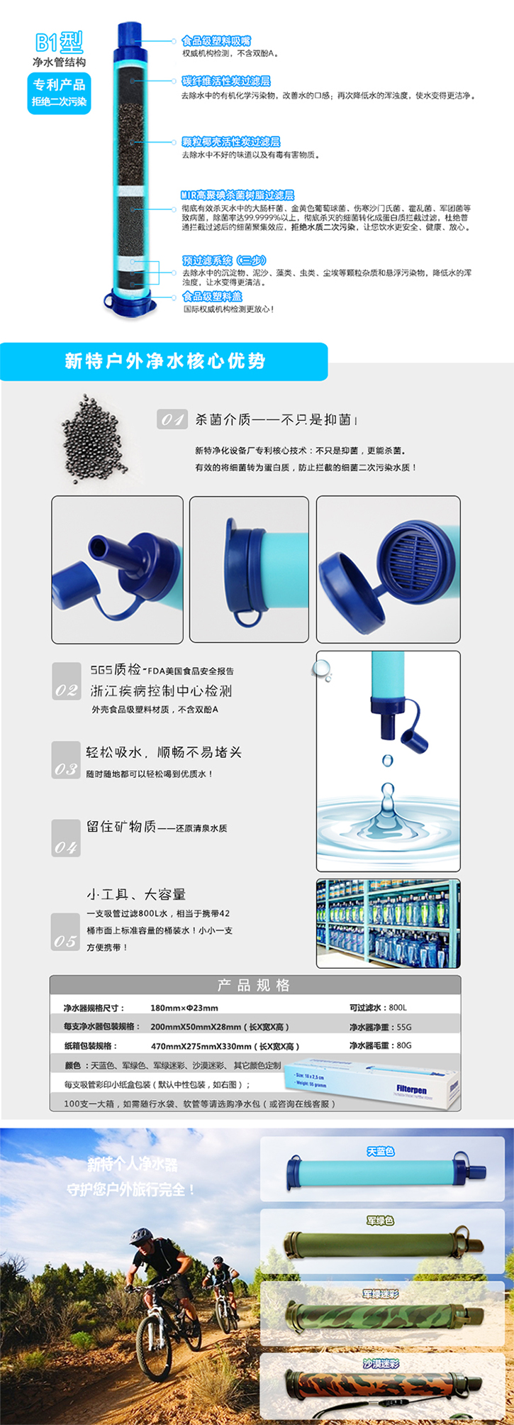 B3型戶外個(gè)人生存凈水器采用高聚碘殺菌樹脂過濾層+顆粒椰殼活性炭過濾層+碳纖維活性炭過濾層+高精度親水超濾膜結(jié)構(gòu),規(guī)格尺寸180×Φ23mm,重量凈重55g毛總70g,顏色為天藍(lán)色,深藍(lán)色,軍綠色等多種可選,使用壽命2000L.